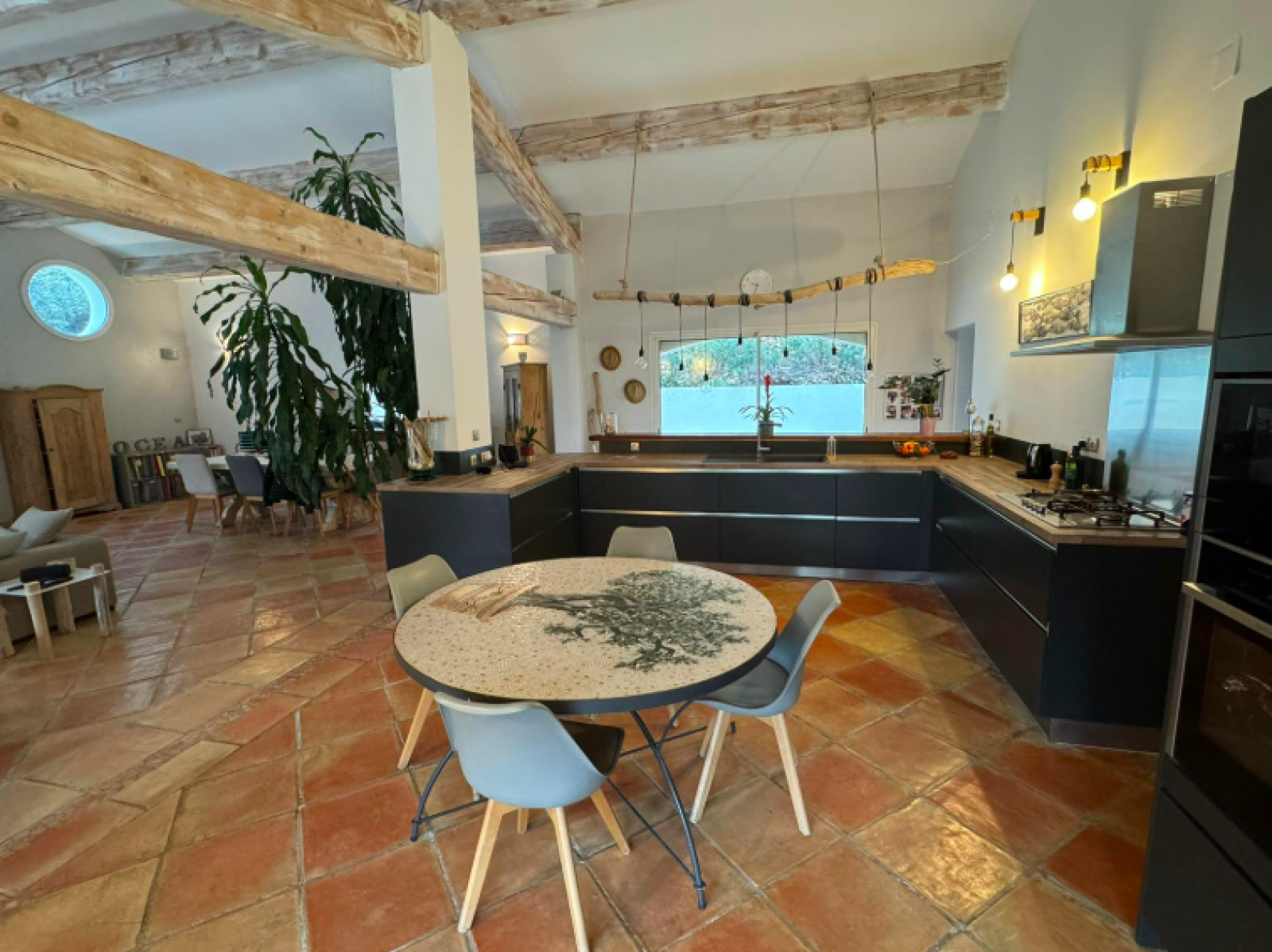 Elle se compose d'une maison principale d'environs 220 m2, entirement de plein pied, belle hauteur sous plafond et poutres apparentes offre un vaste pièce de vie de plus de 100 m2 ensoleillé ouvert sur une terrasse, une suite parentale avec salle d'eau privative, deux chambres, une salle de bains, un dressing et un cellier.
